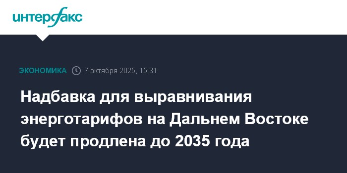 Москва. 7 октября. INTERFAX.RU - Решение о продлении до 2035 г. надбавки для выравнивания энерготарифов на Дальнем Востоке было принято на прошедшем в сентябре совещании по энергетике у президента РФ Владимира Путина, сообщила пресс-служба вице-премьера РФ Юрия Трутнева.
