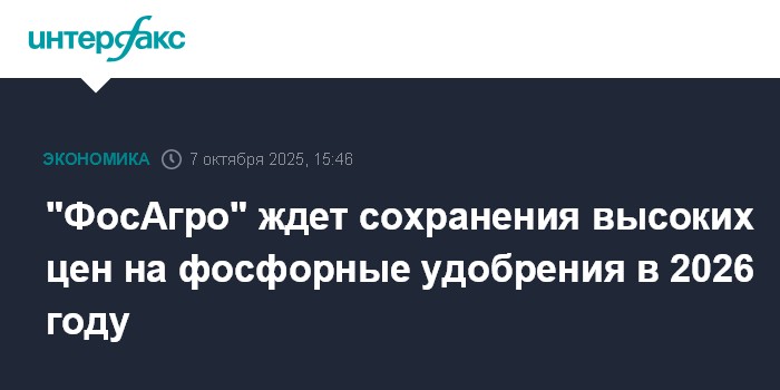 Москва. 7 октября. INTERFAX.RU - "ФосАгро" ждет, что цены на фосфорные удобрения останутся высокими в 2026 году с учетом низкого уровня переходящих запасов на основных рынках и отсутствия нового предложения, заявил начальник отдела по связям с инвесторами компании Андрей Серов на инвестфоруме "Россия зовет! Екатеринбург".