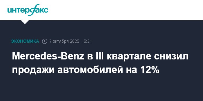 Москва. 7 октября. INTERFAX.RU - Mercedes-Benz AG в третьем квартале 2025 года сократил продажи на 12% в годовом исчислении, до 525,3 тысячи автомобилей с учетом минивэнов, микроавтобусов и малотоннажных грузовиков, сообщила компания.