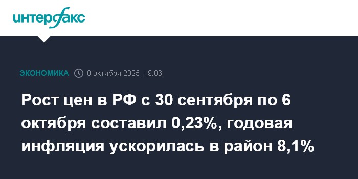 Рост цен в РФ с 30 сентября по 6 октября составил 0,23%, годовая инфляция ускорилась в район 8,1%