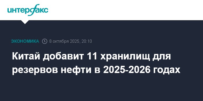 Москва. 8 октября. INTERFAX.RU - Китай добавит одиннадцать хранилищ для резервных запасов нефти в этом и следующем году, судя по данным открытых источников, изученных агентством Reuters.