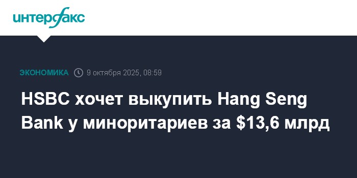 Москва. 9 октября. INTERFAX.RU - Британский банк HSBC сообщил, что направил предложение о выкупе акций своего дочернего гонконгского банка Hang Seng Bank у миноритарных инвесторов, объем сделки может составить 106 млрд гонконгских долларов ($13,6 млрд).