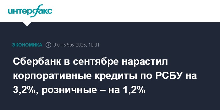 Москва. 9 октября. INTERFAX.RU - Сбербанк в сентябре нарастил корпоративные кредиты по РСБУ на 3,2%, розничные – на 1,2%, говорится в сообщении банка.