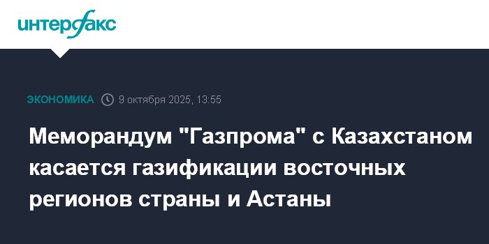 Москва. 9 октября. INTERFAX.RU - Меморандум "Газпрома" с Казахстаном касается газификации восточных регионов Казахстана и Астаны, заявил глава "Газпрома" Алексей Миллер в ходе пленарной сессии Петербургского международного газового форума (ПМГФ-2025).