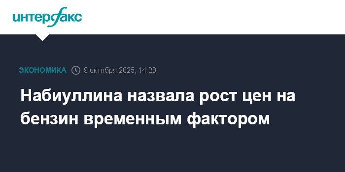 Москва. 9 октября. INTERFAX.RU - Рост цен на бензин носит временный характер, он не является источником устойчивой инфляции, считает председатель ЦБ РФ Эльвира Набиуллина.