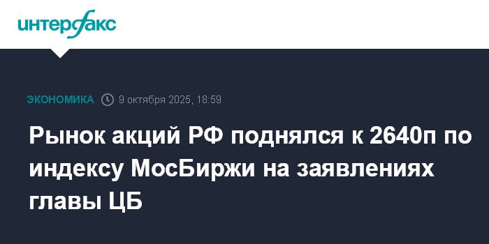 Москва. 9 октября. INTERFAX.RU - Рынок акций РФ в четверг скорректировался вверх на закрытии коротких позиций игроками после падения в условиях сохраняющейся геополитической и санкционной напряженности, поддержкой выступили заявления главы ЦБ РФ о возможном продолжении цикла смягчения монетарной политики. Индекс МосБиржи отскочил в район 2640 пунктов, отыграв большую часть потерь среды, хотя еще днем индекс проваливался в район 2520 пунктов (новый минимум с 20 декабря 2024 года).