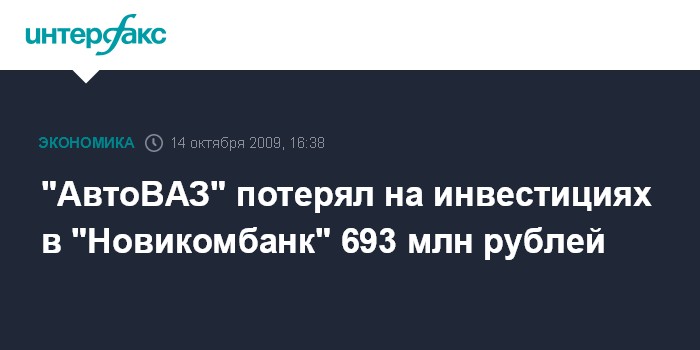 Москва. 14 октября. INTERFAX.RU - Группа "АвтоВАЗ" опубликовала консолидированную финансовую отчетность по международному стандарту (МСФО) за первое полугодие 2009 г., в которой раскрываются итоги сделки по приобретению автогигантом в декабре прошлого года 20% акций ЗАО АКБ "Новикомбанк".