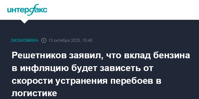 Москва. 13 октября. INTERFAX.RU - Влияние роста цен на бензин в общую инфляцию в РФ будет зависеть от скорости устранения перебоев логистических цепочек нефтяными компаниями, вопрос находится на контроле у Минэнерго, заявил журналистам глава Минэкономразвития РФ Максим Решетников, комментируя вопрос, какие риски несет ускорение роста цен на бензин для общей инфляции.