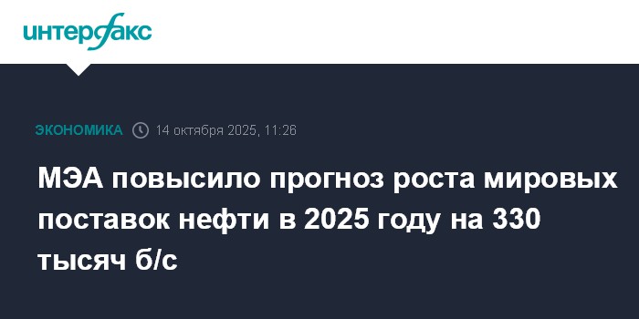 Москва. 14 октября. INTERFAX.RU - Международное энергетическое агентство повысило свою оценку роста мировых поставок нефти в 2025 году на 330 тысяч б/с, в 2026-м - на 290 тысяч б/с, сообщается в ежемесячном отчете МЭА.