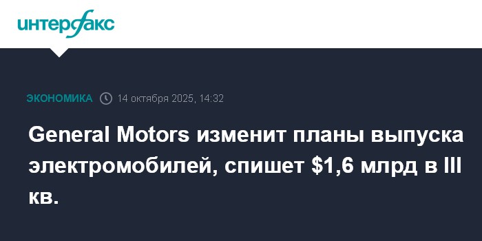 Москва. 14 октября. INTERFAX.RU - Американский автопроизводитель General Motors Co. (GM) зафиксирует разовые списания в размере $1,6 млрд в третьем квартале в связи с корректировкой плана производства электромобилей вслед за отменой властями США программы стимулирования спроса в этом секторе.
