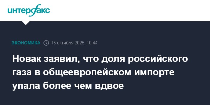 Москва. 15 октября. INTERFAX.RU - Доля российского газа в общем балансе его импорта европейскими странами снизилась до 19%, когда ранее составляла примерно 44%, сообщил вице-премьер РФ Александр Новак в ходе пленарной сессии форума "Российская энергетическая неделя" (РЭН-2025).