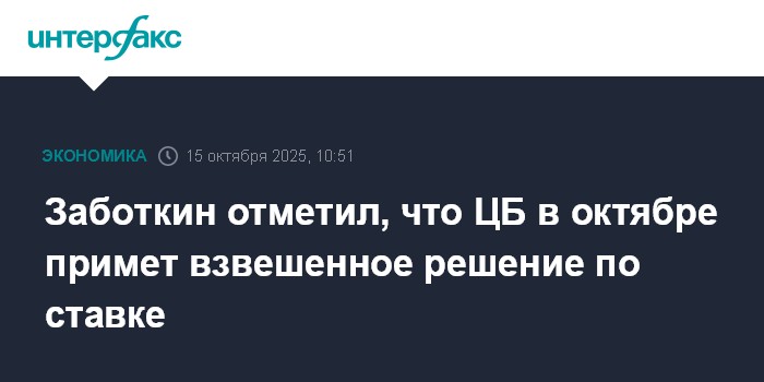 Москва. 15 октября. INTERFAX.RU - Совет директоров Банка России на очередном заседании по ставке в октябре примет взвешенное решение по ключевой ставке, исходя из всех поступивших к тому моменту данных, заявил зампред ЦБ РФ Алексей Заботкин на заседании совместной рабочей группы в Госдуме.