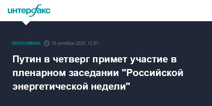 Москва. 15 октября. INTERFAX.RU - Президент РФ Владимир Путин в четверг, 16 октября, примет участие в пленарном заседании восьмого Международного форума "Российская энергетическая неделя" (РЭН), сообщила пресс-служба Кремля.