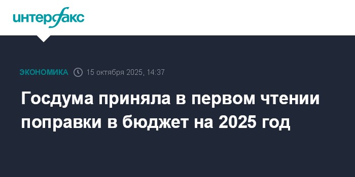 Москва. 15 октября. INTERFAX.RU - Госдума приняла в первом чтении законопроект о корректировке федерального бюджета на 2025 г. Документ уточняет параметры доходов, расходов и дефицита бюджета с учетом текущей макроэкономической ситуации, исполнения бюджета за январь-август 2025 г.