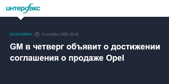 Москва. 14 октября. INTERFAX.RU - Американская General Motors уже в четверг объявит о достижении соглашения о продаже 55%-ной доли в Opel альянсу канадской Magna и российского Сбербанка, сообщает Financial Times.