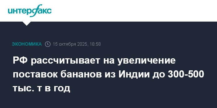 Москва. 15 октября. INTERFAX.RU - РФ рассчитывает на увеличение поставок бананов из Индии до 300-500 тыс. тонн. Об этом сообщает Россельхознадзор по итогам переговоров руководителя службы Сергея Данкверта с представителями министерства рыболовства, животноводства и молочного хозяйства и министерства торговли и промышленности Индии.