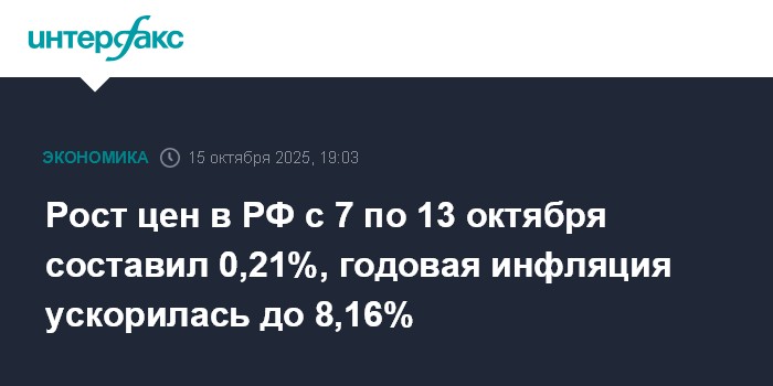 Рост цен в РФ с 7 по 13 октября составил 0,21%, годовая инфляция ускорилась до 8,16%