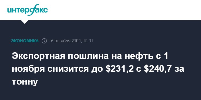 Москва. 15 октября. INTERFAX.RU - Пошлина на вывоз нефти из РФ с 1 ноября составит $231,2 за тонну, свидетельствуют расчеты агентства "Интерфакс-АФИ". С 1 октября пошлина составляет $240,7 за тонну. Пошлина снизится в результате того, что средняя цена Urals за последний месяц оказалась на $2 ниже, чем в предыдущий период мониторинга.