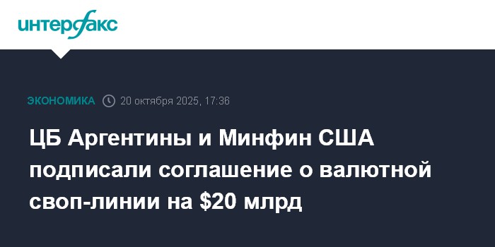 Москва. 20 октября. INTERFAX.RU - Центробанк Аргентины и Министерство финансов США подписали соглашение о валютной своп-линии на сумму $20 млрд, сообщает Bloomberg со ссылкой на аргентинского регулятора.