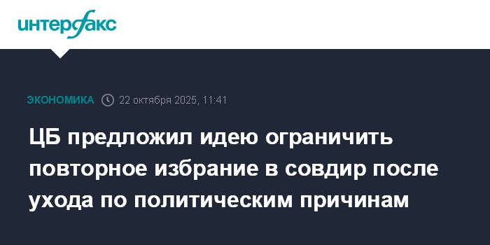 Москва. 22 октября. INTERFAX.RU - Банк России предлагает обсудить идею ограничения на вхождение в советы директоров акционерных обществ тех лиц, которые ранее немотивированно покинули свои посты, например, по политическим причинам.