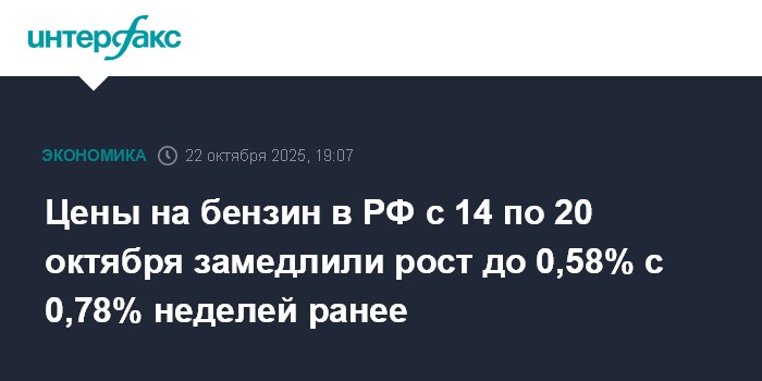 Цены на бензин в РФ с 14 по 20 октября замедлили рост до 0,58% с 0,78% неделей ранее