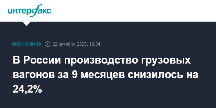 Москва. 22 октября. INTERFAX.RU - В России в январе-сентябре 2025 года производство грузовых магистральных ширококолейных вагонов снизилось на 24,2% в годовом исчислении, до 41,5 тысячи, сообщается в материалах Росстата.