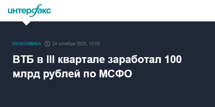 Москва. 24 октября. INTERFAX.RU - ВТБ в третьем квартале 2025 года увеличил чистую прибыль по МСФО на 2,1% в годовом исчислении, до 100 млрд рублей, свидетельствует отчетность группы.