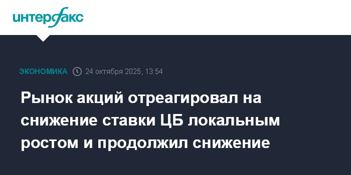 Москва. 24 октября. INTERFAX.RU - Российский рынок акций отреагировал локальным ростом на решение Банка России снизить ключевую ставку на 0,5 процентного пункта (до 16,5% годовых), однако быстро растерял весь подъем из-за ухудшения прогнозов регулятора по ставке на 2026 год.