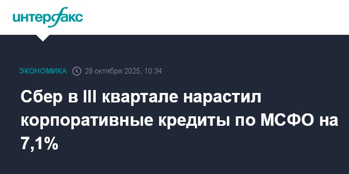 Москва. 28 октября. INTERFAX.RU - Сбербанк в III квартале 2025 года нарастил корпоративное кредитование на 7,1% (после 1,8% во II квартале), розничное - на 2,1% (0,9% во II квартале), говорится в пресс-релизе банка по итогам отчетности по МСФО.