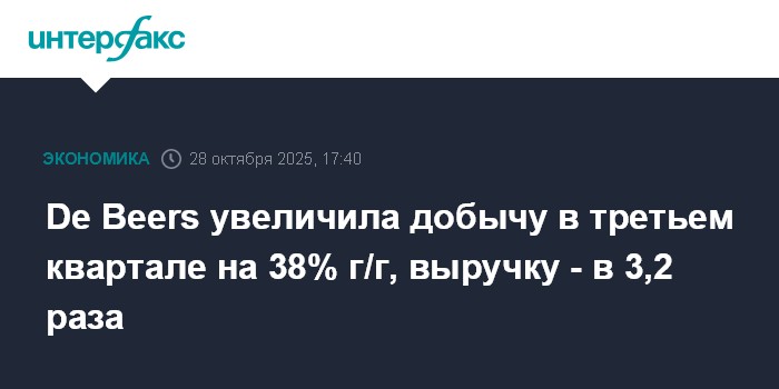 Москва. 28 октября. INTERFAX.RU - De Beers в третьем квартале 2025 года увеличила производство алмазов на 38% г/г, выпустив 7,7 млн карат, сообщила контролирующая алмазодобытчика компания Anglo American.