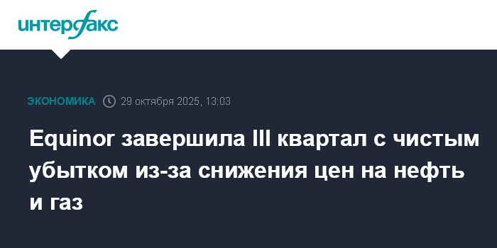 Москва. 29 октября. INTERFAX.RU - Норвежская нефтегазовая компания Equinor ASA завершила третий квартал 2025 года с чистым убытком из-за снижения цен на углеводороды и списания стоимости активов.