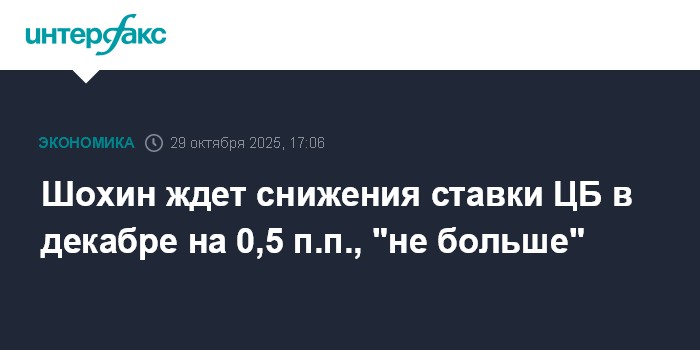 Шохин ждет снижения ставки ЦБ в декабре на 0,5 п.п., "не больше"