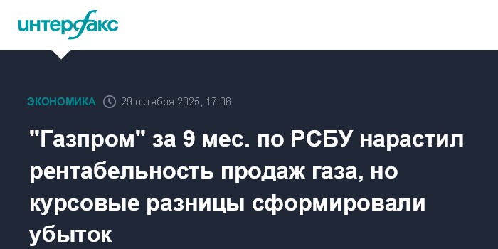 Москва. 29 октября. INTERFAX.RU - Головная компания ПАО "Газпром" за три квартала 2025 года показала значительный рост рентабельности реализации газа. При этом чистый убыток головной компании был сформирован главным образом под влиянием курсовых разниц по операциям в иностранной валюте, сообщается в бухгалтерской отчетности ПАО "Газпром" по российским стандартам (РСБУ).