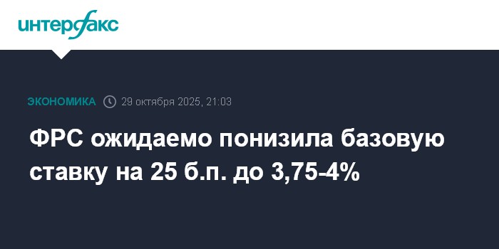 Москва. 29 октября. INTERFAX.RU - Федеральная резервная система США ожидаемо понизила процентную ставку по федеральным кредитным средствам (federal funds rate) на 25 базисных пунктов (б.п.), до 3,75-4% годовых, сообщил Федеральный комитет на открытом рынке (FOMC).