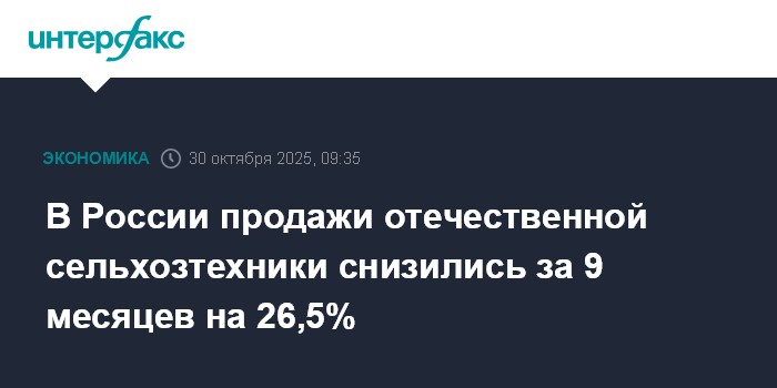 Москва. 30 октября. INTERFAX.RU - Продажи российской сельхозтехники на внутреннем рынке в январе-сентябре 2025 года снизились на 26,5%, до 114,3 млрд рублей, подсчитали в Российской ассоциации производителей специализированной техники и оборудования ("Росспецмаш").