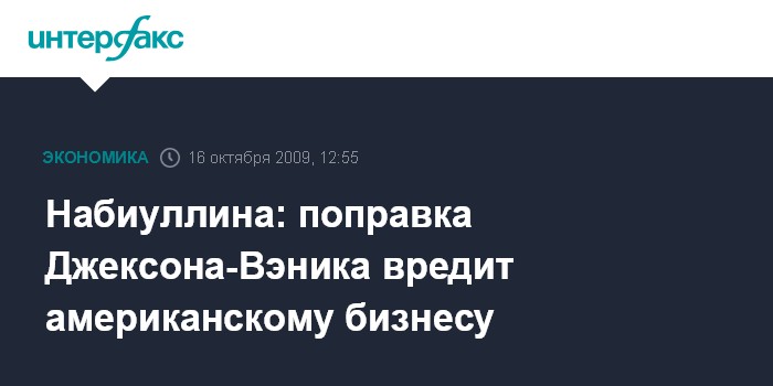 Москва. 16 октября. INTERFAX.RU - Поправка Джексона-Вэника, ограничивающая торговлю между Россией и США, является анахронизмом и может нанести ущерб американским компаниям, заявила министр экономического развития РФ Эльвира Набиуллина. Министр напомнила, что поправка была напрямую связана с возможностью эмиграции евреев из СССР. "Советского Союза давно нет, проблема давно решена, а поправка так и осталась, и она, конечно, никоим образом не должна быть увязана с торговыми отношениями", - отметила Набиуллина.