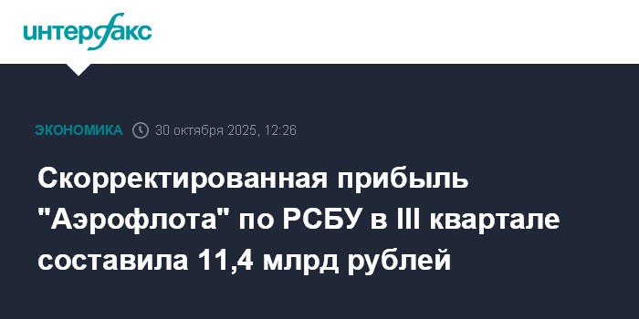 Москва. 30 октября. INTERFAX.RU - Скорректированная прибыль "Аэрофлота" по РСБУ в III квартале 2025 года составила 11,4 млрд рублей, сообщила компания.