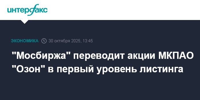 Москва. 30 октября. INTERFAX.RU - "Московская биржа" с 1 ноября переведет обыкновенные акции МКПАО "Озон " из раздела "третий уровень" в раздел "первый уровень" списка ценных бумаг, допущенных к торгам.