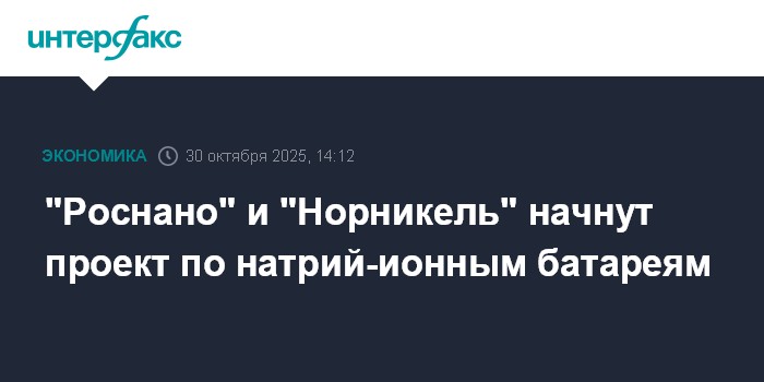 Москва. 30 октября. INTERFAX.RU - "Роснано" и "Норильский никель" начнут реализацию проекта по натрий-ионным батареям, сообщил на встрече с президентом РФ Владимиром Путиным глава "Роснано" Сергей Куликов.