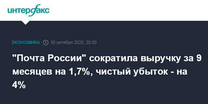 Москва. 30 октября. INTERFAX.RU - Выручка АО "Почта России" за девять месяцев по РСБУ составила 158,1 млрд рублей, что на 1,7% меньше, чем за аналогичный период 2024 года, говорится в бухотчетности компании.