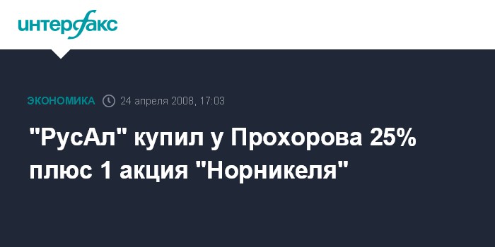 "РусАл" купил у Прохорова 25% плюс 1 акция "Норникеля"