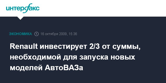 Тольятти. 16 октября. INTERFAX.RU - Французская Renault инвестирует две третьих от суммы, необходимой для запуска новых моделей АвтоВАЗа на французской платформе, сообщил журналистам в пятницу вице-президент по стратегии предприятия Григорий Хворостянов.
