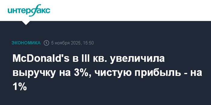 Москва. 5 ноября. INTERFAX.RU - Американская McDonald's Corp., крупнейшая в мире сеть ресторанов быстрого питания, слабо увеличила чистую прибыль и выручку в третьем квартале 2025 года, причем скорректированная прибыль оказалась хуже ожиданий рынка, а выручка совпала с прогнозами.