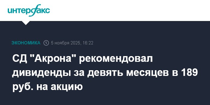 Москва. 5 ноября. INTERFAX.RU - Совет директоров "Акрона" рекомендовал выплатить дивиденды по итогам девяти месяцев 2025 года в размере 189 руб. на акцию, сообщила компания.