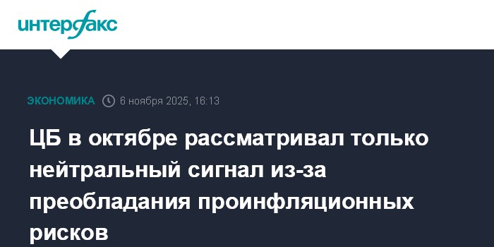Москва. 6 ноября. INTERFAX.RU - ЦБ РФ за заседании в октябре, как и в сентябре, рассматривал только нейтральный сигнал о будущей направленности денежно-кредитной политики (ДКП), так как проинфляционные риски преобладают и могут потребоваться паузы в снижении ставки, говорится в резюме обсуждения ставки.