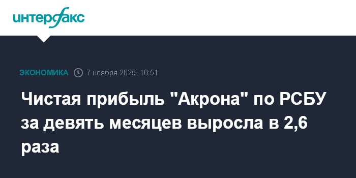 Москва. 7 ноября. INTERFAX.RU - Чистая прибыль ПАО "Акрон" по РСБУ за 9 месяцев выросла в 2,6 раза к аналогичному периоду прошлого года, до 38 млрд рублей, говорится в отчете компании.