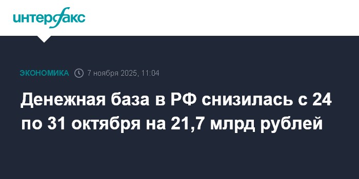Денежная база в РФ снизилась с 24 по 31 октября на 21,7 млрд рублей