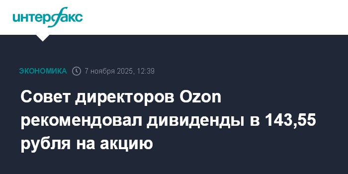 Москва. 7 ноября. INTERFAX.RU - Совет директоров МКПАО "Озон" рекомендовал первые в истории компании дивиденды - в 143,55 рубля на акцию по итогам 9 месяцев 2025 года. Решение было принято на заседании 6 ноября, говорится в материалах компании.