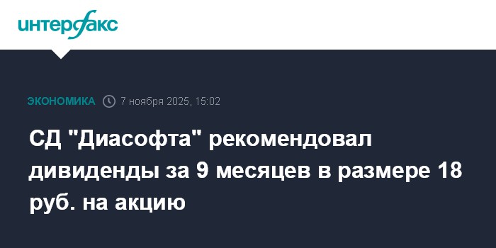 Москва. 7 ноября. INTERFAX.RU - Совет директоров ПАО "Диасофт" рекомендовал выплатить дивиденды за 9 месяцев 2025 года в размере 18 рублей на одну акцию, говорится в сообщении компании.
