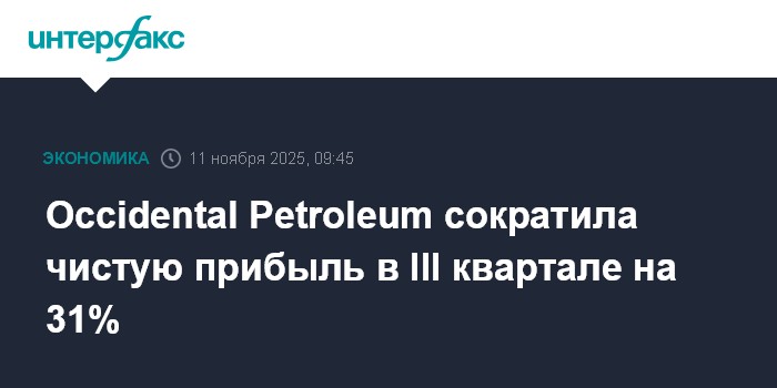 Москва. 11 ноября. INTERFAX.RU - Американский сланцевый производитель Occidental Petroleum сократил чистую прибыль в третьем квартале 2025 года на 31%, выручку - на 6%.